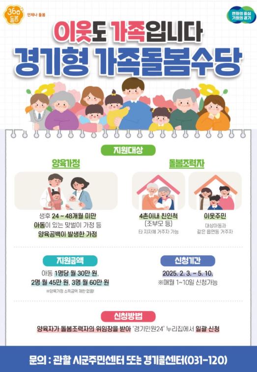 경기도는 ‘경기형 가족돌봄수당’을 통해 조부모가 손주를 월 40시간 이상 돌보면 아동 1명당 월 30만 원을 지원합니다. 일부 시군은 금액과 조건이 다르니 꼭 확인해야 합니다.